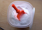 捨てるつもりだったタッパーの容器と計量スプーン。そして計量カップ。計量スプーンでエビを掬ったり、ちょっとした水足し等。 |